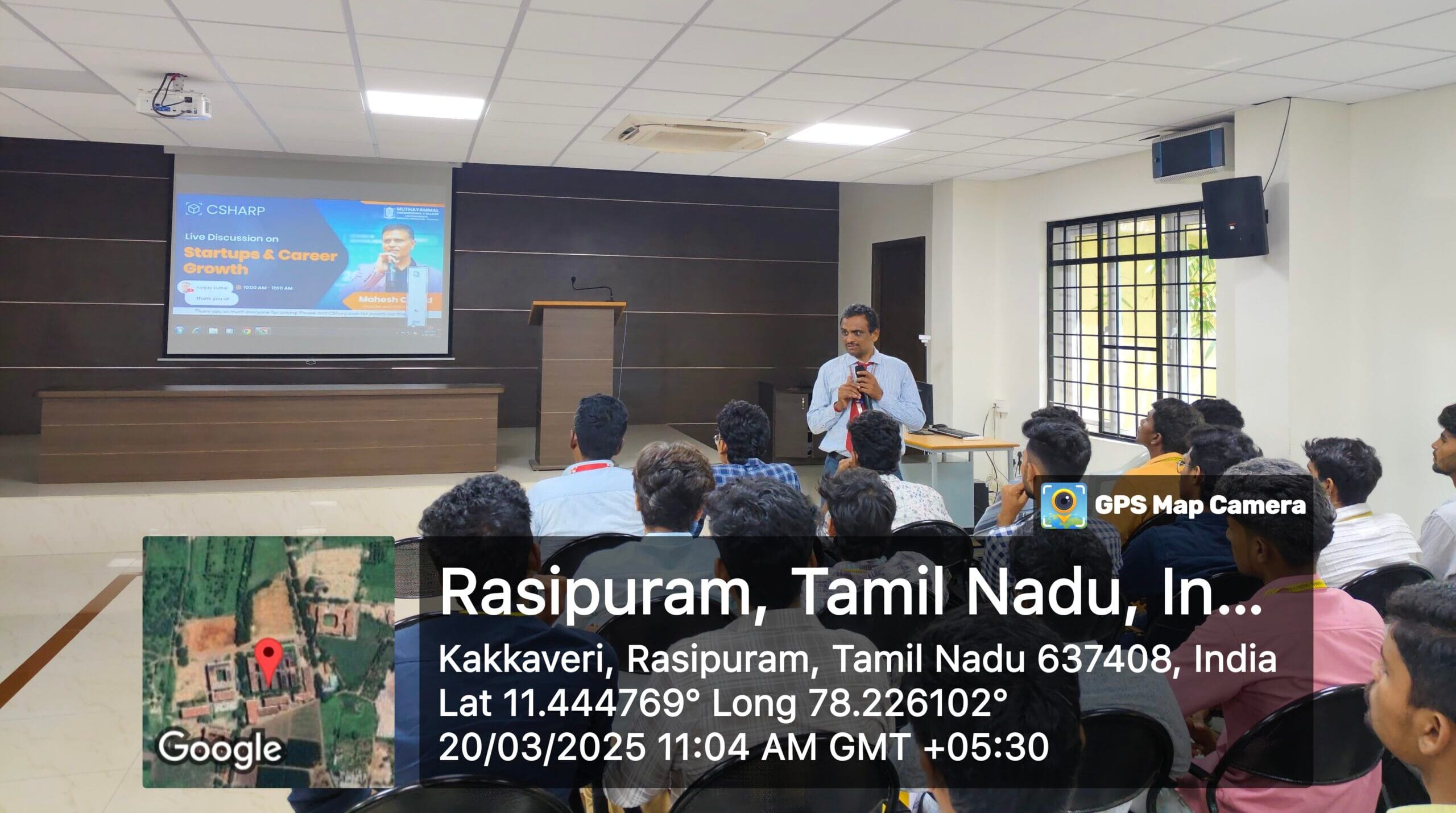 Muthayammal Engineering College in Rasipuram, in collaboration with C Sharp Corner, hosted a National Level webinar on March 20, 2025, entitled “Live Discussion on Startups and Career Growth,” which was facilitated by Mahesh Chand. The event attracted over 1,100 student participants. Mahesh Chand shared invaluable insights on how to successfully launch startups and advance in one’s career. The discussion covered essential topics such as establishing a business from the ground up, navigating role transitions and the significance of networking and mentorship. He also addressed strategies for scaling businesses while ensuring a healthy work-life balance and examined various funding avenues, including bootstrapping and venture capital. The students actively participated in the discussions, acquiring practical knowledge related to entrepreneurship and career advancement. In summary, the session provided actionable insights for aspiring entrepreneurs and professionals aiming to progress in their careers.