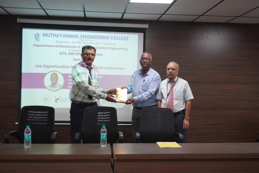 The Department of Electronics and Communication Engineering hosted a seminar on Job Opportunities in Core Electronics Industries, featuring an expert presentation by Mr. Balajee Seshadri, Consultant at Infineon Technologies, Bangalore. He addressed students on the significance of fundamental knowledge and industry readiness on 18.09.2025.