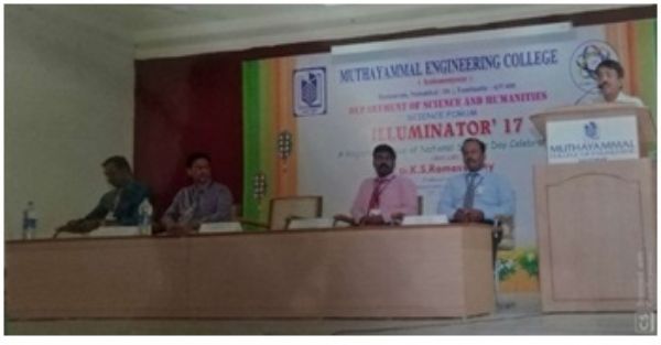 In order to Celebrate the National Science Day on 28.02.2017 the Department of Science and Humanities organized a Symposium for our first year students. The Chief Guest, Dr.K.S.Ramaswamy, Professor and Head, Department of Mathematics, CIT, Coimbatore, motivated the students to learn about science and technology to create new things.