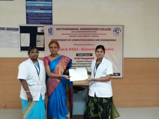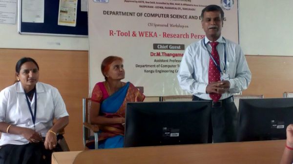 Workshop and Faculty Recharge Programme “R Tool & WEKA – Research Perspective” held on 30-10-2019. The Chief Guest Dr. M. Thangamani Assistant Professor, Department of Computer Science and Engineering, Kongu Engineering College, Perundurai had recharged the mind of the Faculty towards Recent Tools and its Implementation. Data mining tools and also some new era tools are discussed in detailed for the faculty.