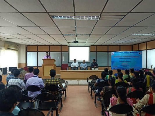 The Department of Information Technology organized a seminar entitled Blockchain Technology on 28.09.2019. Dr.Kunwar Singh, National Institute of Technology, Trichy, addressed teaching fraternity and the student community. The purpose of this seminar is to educate the students about Cryptography and Blockchain technology.